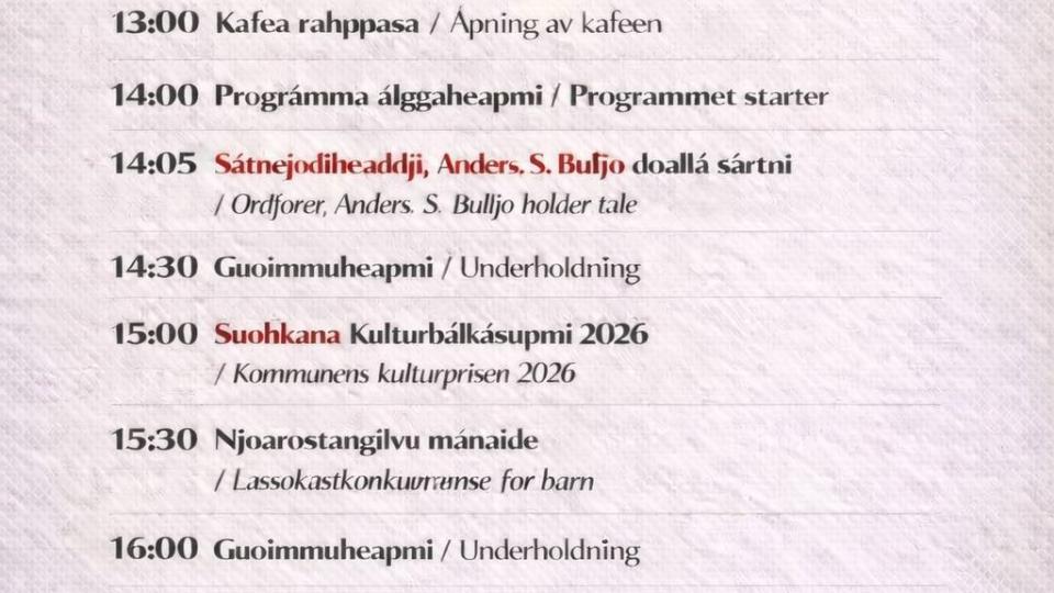 Samenes nasjonaldag markeres i Guovdageaidnu Det inviteres til feiring av samenes nasjonaldag i Báktehárji med taler, kulturinnslag, kafé og aktiviteter for barn. Programmet starter kl. 14:00, me... Publisert 03.02.2026 kl. 16.50