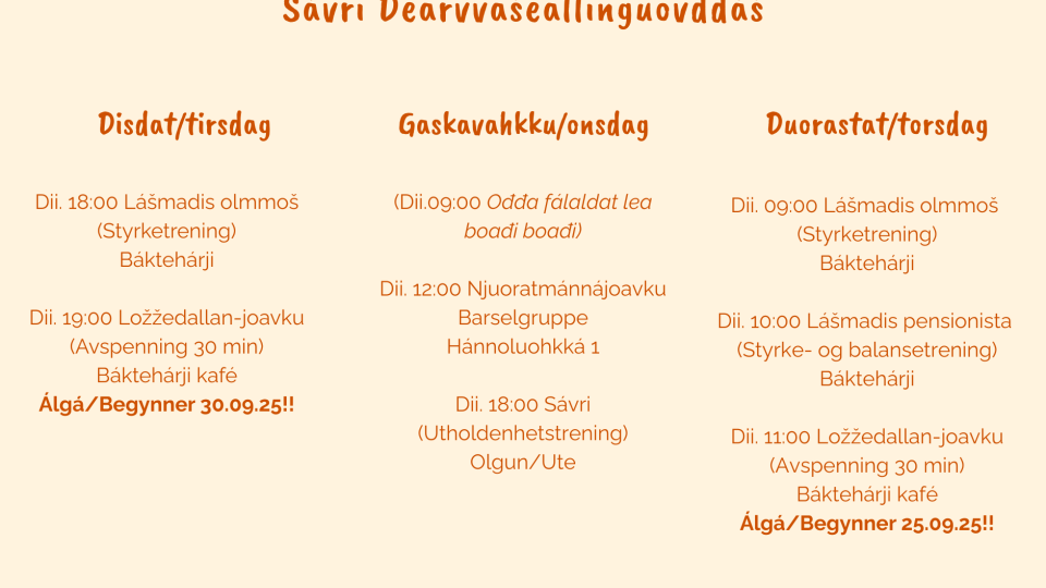 Nye tilbud ved Sávri Frisklivssentral I morgen 25. september er det oppstart av nye tilbud ved Sávri Frisklivssentral. Publisert 24.09.2025 kl. 13.18